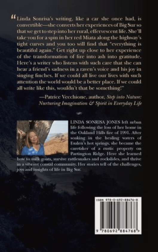 “Linda Sonrisa’s writing, like a car she once had, is convertible—she converts her experiences of Big Sur so that we get to step into her rural, effervescent life. She’ll take you for a spin in her red Miata along the highway’s tight curves and you too will find that “everything is beautiful again.” Get right up close to her experience of the transformation of fire into ash into gratitude. Here’s a writer who listens with such care that she can hear a friend’s sadness in a raven’s voice and his joy in singing finches. If we could all live our lives with such attention the world would be a better place. If we could all write like this, wouldn’t that be something!”